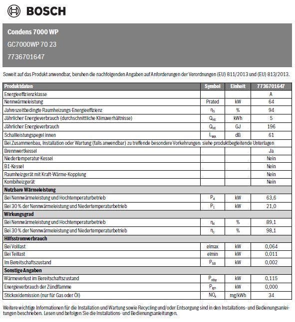 max. Nennwärmeleistung (80/60grdC): 63,6 kW - max. Nennwärmebelastung Heizung: 64,3 kW