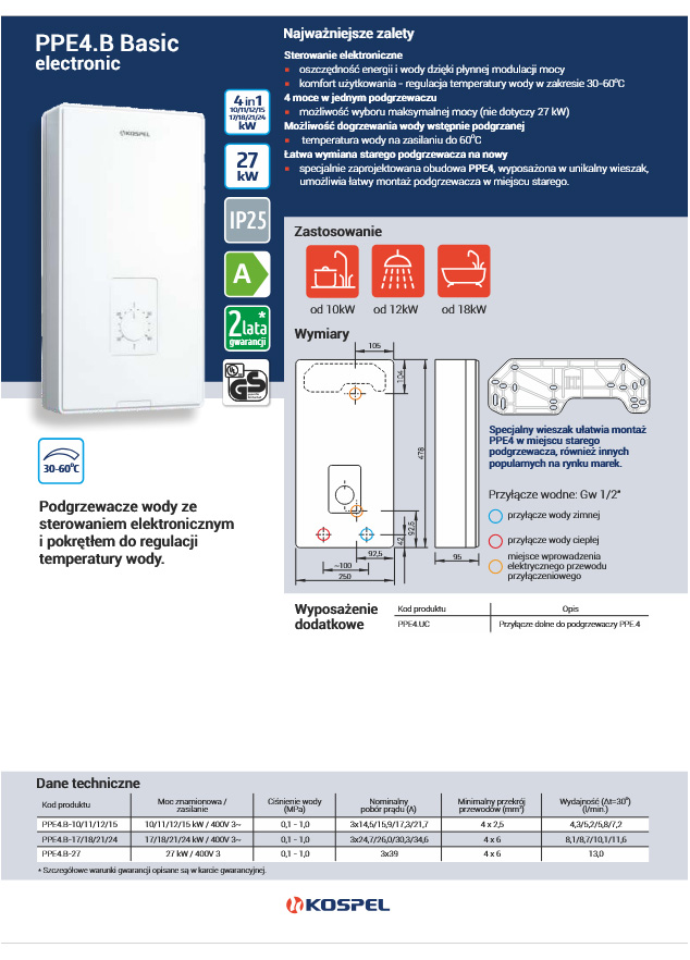 - bei maximaler Leistung bei 60 C und 12 C Kaltwasser-Eintrittstemperatur: 7,9 l/min - Elektrischer Anschluss: 400 V