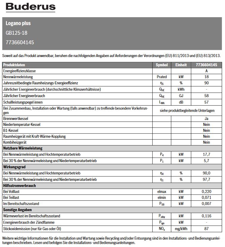 Buderus Logano plus GB125, Öl-Brennwert- kessel mit einem integriertem Edelstahl- Wärmetauscher und Buderus Öl-Blaubrenner Logatop BE. Kesselglieder aus hochwerti- gem Gusseisen, wassergekühlter Brennraum mit darüber angeordneter Nachschaltheiz- fläche, große Fronttür nach links oder rechts aufschwenkbar, hochwertiger Wärmeschutz und blau pulverlackierter Kesselmantel. Brennwert-Wärmetauscher aus hochwertigem Edelstahl mit optimierten Positionen von Reinigungsöffnungen bei Kompakt-Bauweise. - Buderus Öl-Blaubrenner Logatop BE. Vollautomatischer Druckzerstäuberbrenner 1-stufig nach DIN EN 267 für Heizöl EL Standard + schwefelarm (kleiner 0,005 %) nach DIN 51603. Mit optimiertem Misch- system mit thermodynamischer Gemischaufbereitung, transparent blau brennende Flamme, praktisch rußfreie Verbrennung, geringe NOx- und CO-Werte, Ölvorwärmung und Öl-Abschlusssystem, UV-Überwachung, steckerfertig verdrahtet, Brennerhaube, Einhängevorrichtung für Serviceposition, werkseitig eingestellt und warm geprüft. Regelgerät Logamatic MC110 mit einem elektronischen Kesselwasserregler und einem elektronischen Sicherheitstemperaturbegrenzer sowie mit Anschlüssen für Warmwasserbereitung und einen Heiz- kreis ohne Mischer. - - Elektronischer Kesselwasser-Temperaturregler zur Begrenzung der Kesselwasser-Maximaltemperatur - Elektronischer Sicherheitstemperaturbegrenzer - Warmwasser-Temperaturregler zur Einstellung der Warmwassertemperatur - Schornsteinfeger- oder Abgastestfunktion mit automatischer Rücksetzung - Fühlerpositions- oder auch STB-Test - "Service-Taster" zum Umschalten des Displays auf die unterschiedlichen Funktionen - LED Anzeigen für Wärmeanforderung und Warmwasseranforderung - Notbetriebsfunktion