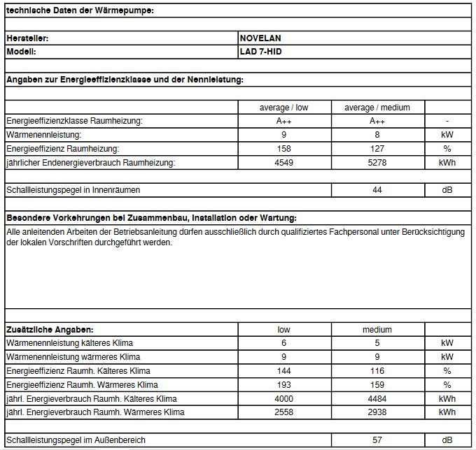 Novelan Hydraulikmodul HV 9H, 9kW Elektroheizelement, mit Wärmepumpenregler, Heizung Herstellerteilenummer: 15220541 Beschreibung: Klasse des Reglers: VII Beitrag des Reglers zur Raumheizungs- Energieeffizienz: 3,5 % Gerätebeschreibung: Anschlussfertige Hydraulikkombination zur Wandmontage fertig isoliert. Zur schnelleren Installation sind folgende Komponenten integriert oder im Lieferumfang: Energieeffizienz- Umwälzpumpe, Ausdehnungsgefäß, Sicherheitsbaugruppe, Elektroheizelement, Vor- und Rücklauffühler, Absperrkugelhähne, Entleerungshahn, Wärmemengenerfassung und Außenfühler. Integrierter Wärmepumpenregler Witterungsgeführter Heizungs- und Wärmepumpenregler mit Vollgrafikdisplay und Menüführung, laufzeitoptimierte und wärmebedarfsabhängige Verdichteransteuerung. Alle Betriebsarten einzeln programmierbar, automatische Heizgrenzfunktion, Legionellenschutzprogramm, Estrichausheizprogramm, Pumpenoptimierungsprogramm, Ansteuerung von mehreren Wärmeerzeugern, Ansteuerung eines Mischkreises (Lade- / Entlade- / Kühl), Datenloggerfunktion, Fehlerdiagnoseprogramm mit Fehlerspeicher, Kurzprogramm für Kundendienst, Inbetriebnahme-Assistent, Entlüftungsprogramm, Schnellladefunktion für Trinkwarmwasserbereitung, automatische Sommer- / Winterzeitfunktion, Urlaubszeitfunktion, netzwerkfähig (mit integriertem Webserver), USB-Schnittstelle, Mehrsprachigkeit. Der Regler ermöglicht einen schallreduzierten Nachtbetrieb (Silent Mode). Durch Zusatzplatinen und umfangreiches Zubehör ist der Regler erweiterungsfähig. Technische Daten: Umgebungstemperatur: 5 C - 35 C Freie Pressung bei 1200 l/h Heizwasservolumenstrom: 0,72 bar Maximaler Heizwasser-Volumenstrom: 2500 l/h Maße (B x T x H ohne Schnittstellen und Bedienteil): 610 x 365 x 995 mm Gewicht gesamt: 40kg Schallleistungspegel: 44dB(A) Spannungscode Verdichter: 1-N/PE/230V/50Hz Spannungscode Heizelement: 3-N/PE/400V/50Hz Spannungscode Steuerspannung: 1-N/PE/230V/50Hz Elektroheizelement 3 / 2 / 1 phasig: 9 / 6 / 3 kW Geeignet für Helox 5, Helox 8, Helox 11 und Helox 16. Lieferumfang: Novelan Hydraulikmodul HV 9H, 9kW Elektroheizelement, mit Wärmepumpenregler Montage- und Bedienungsanleitung Installation: Für die Installation dieses Gerätes ist ein 400V Starkstromanschluss (Drei-Phasen-Wechselanschluss) notwendig, die Montage (Wasser und Elektroinstallation) sowie die Erstinbetriebnahme und die Wartung dieses Gerätes dürfen nur von einer Elektrofachkraft in Übereinstimmung mit den gültigen Vorschriften sowie entsprechend dieser Anweisung ausgeführt werden!