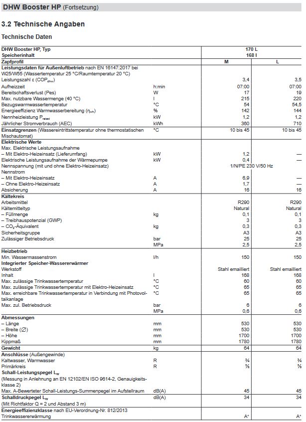 - Mit dem Speicherinhalt ist die DHW Booster HP sowohl für 4-Personen-Haushalte (Zapfprofil M), als auch für größere Haushalte (Zapfprofil L) geeignet